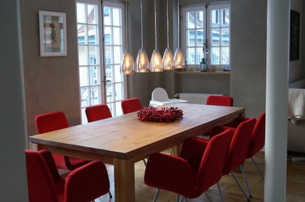 - großes Wohn- und Esszimmer mit hohen Stuckdecken und modernem Holzofen